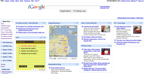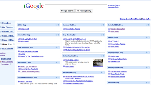 I use iGoogle for tracking my student’s blogs as you get a look at everyone’s blog at once and determine who has completed their work. I have a snapshot of the page here.