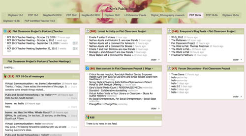 I use iGoogle for tracking my student’s blogs as you get a look at everyone’s blog at once and determine who has completed their work. I have a snapshot of the page here.